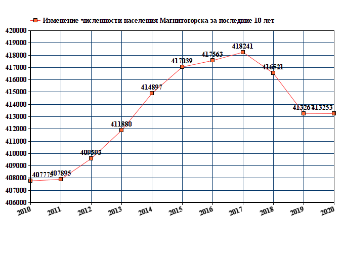 Данные по количеству населения получены от службы государственной статистики. График изменения численности горожан за последние 10 лет.