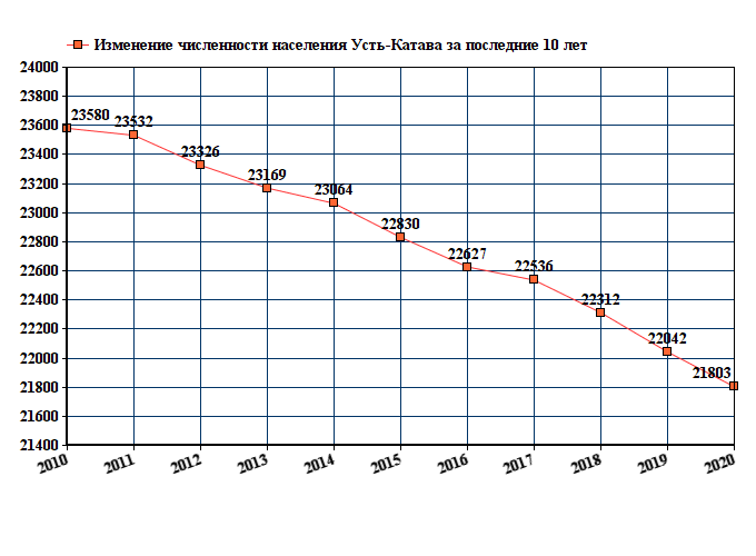 Данные с графика показывают стабильное снижение численности населения с 23580 человек в 2010 году до 21016 человек в 2023 году.
