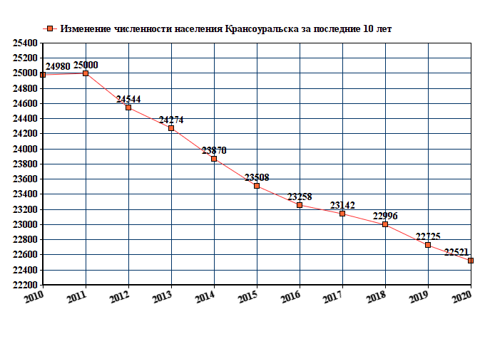 Данные с графика показывают стабильное снижение численности населения с 24980 человек в 2010 году до 21507 человек в 2022 году.
