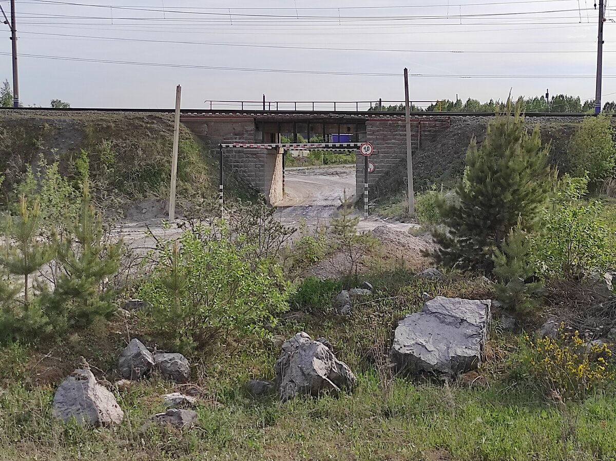 После проезда под мостом нужно проехать около километра по дороге, покрытой белой минеральной пылью, на которой встречаются мощные красивые грузовые машины, перевозящие сыпучую продукцию известкового завода