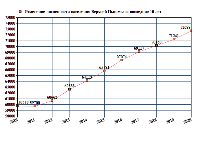 Данные с графика показывают уверенный рост численности населения с 59749 человек в 2010 году до 71335 человек в 2022 году.